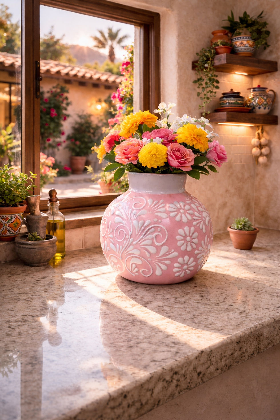 Pink Talavera Vase With White Floral Design | Handcrafted Statement Piece