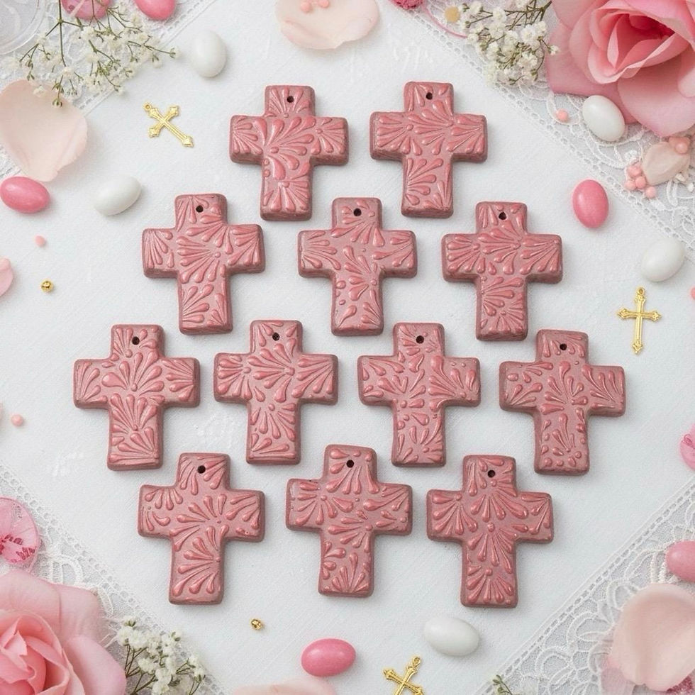 Set Of 12 Handmade Pink Talavera Cross Favors | Blush Baptism & First Communion