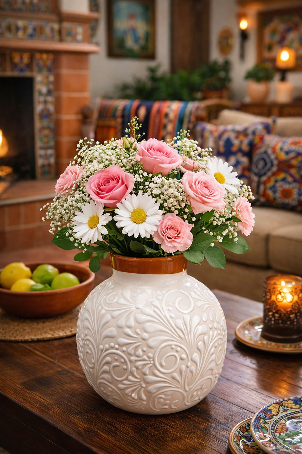 White & Brown Talavera Vase White Floral Design | Handcrafted Statement Piece