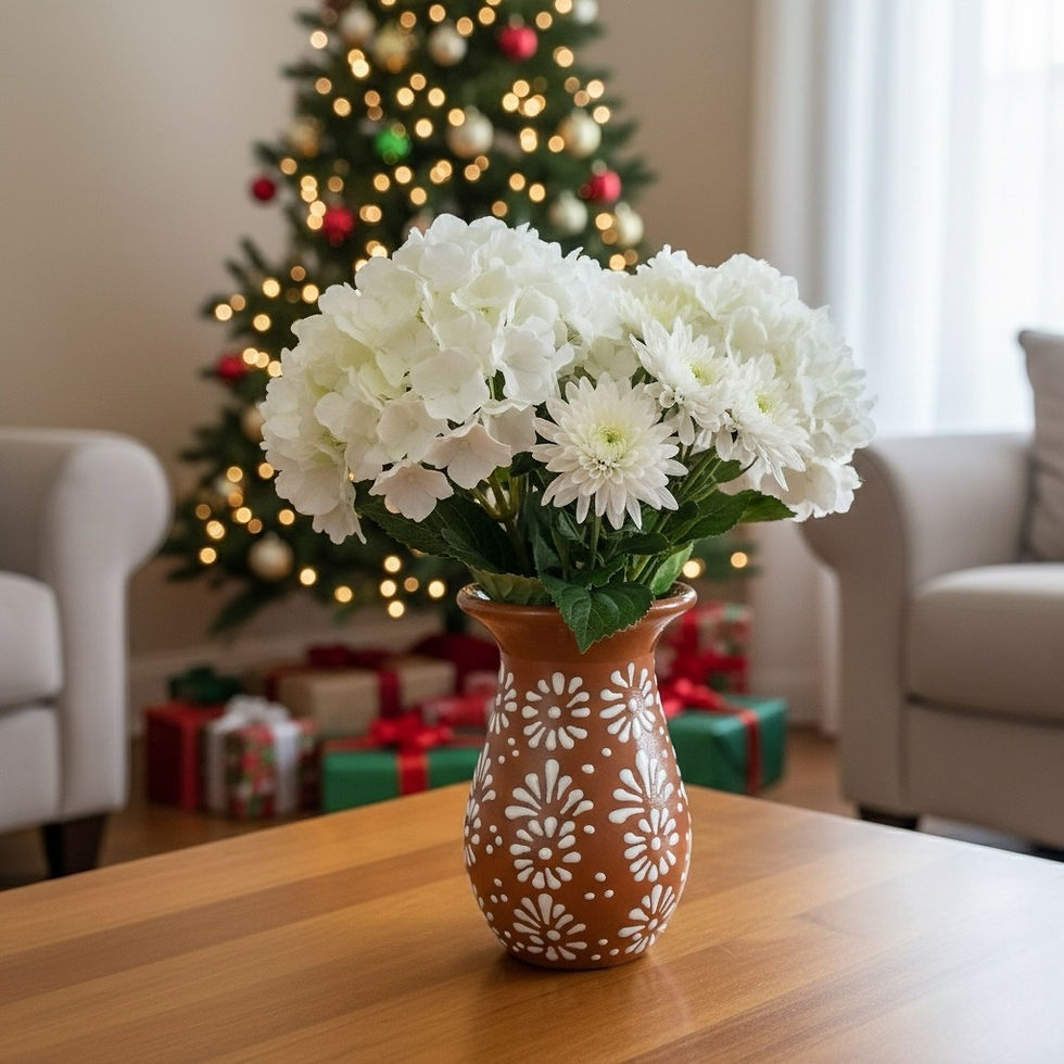This festive Talavera Christmas mug features a soft green base accented with hand-painted white and dark-green splash motifs that give it a lively, holiday look. The front showcases a bright green Grinch wearing a classic Santa hat, paired with the bold “Merry Christmas” lettering in black. The glossy white rim adds a clean, wintery touch to the overall design. At 4x4 inches, this mug is perfect for enjoying holiday drinks, gifting, or adding seasonal charm to any home. Fully lead free and handcrafted with care.